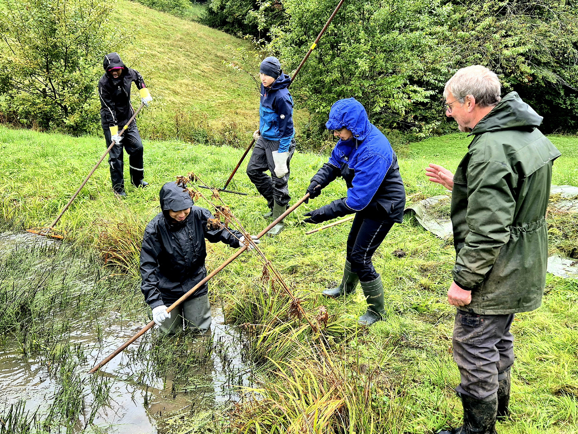 Drei Sekundarklassen verbrachten ihre Projektwochen in unserer Region und drei Gymnasialklassen der Kanti Wil arbeiteten je zwei Tage an diversen Standorten. Mit Rechen und Gabeln wurde September-Heu in 12 feuchten Hangried- oder Trocken-Wiesen zusammengenommen, Brombeeren geschnitten und Amphibien-Tümpel und -Weiher gepflegt oder ausgehoben und mit Lehm abgedichtet. Weiter wurden Asthaufen mit Wiesel-Aufzuchtkammern gebaut und zwei Nistkästen an der Murg für den Wiedehopf platziert. Weiter wurde beim Gelbbauchunken Hot-Spot-Lebensraum und am Reptilien-Lehrpfad mit strenger körperlicher Arbeit gebuddelt und geholzt.