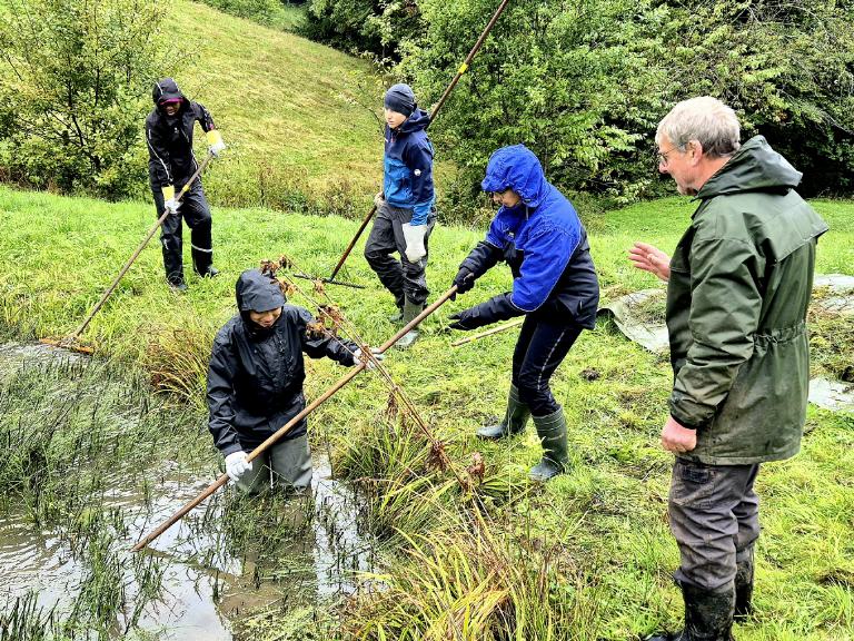 Beide Klassen waren neben anderen Einsatzorten auch beim Schützenhaus und in der Kiesgrube Oberwangen tätig. Bei Sonnenschein und einmal bei Regen wurden zwei Wasserschläuche vergraben, ein Tümpel ausgehoben und mit Folie abgedichtet und Neophyten gezupft. Damit die Gelbbauchunken, Ringelnattern und all die anderen Tiere sich wohl fühlen und sich vermehren brauch dieser Hotspot regelmässige Pflege.